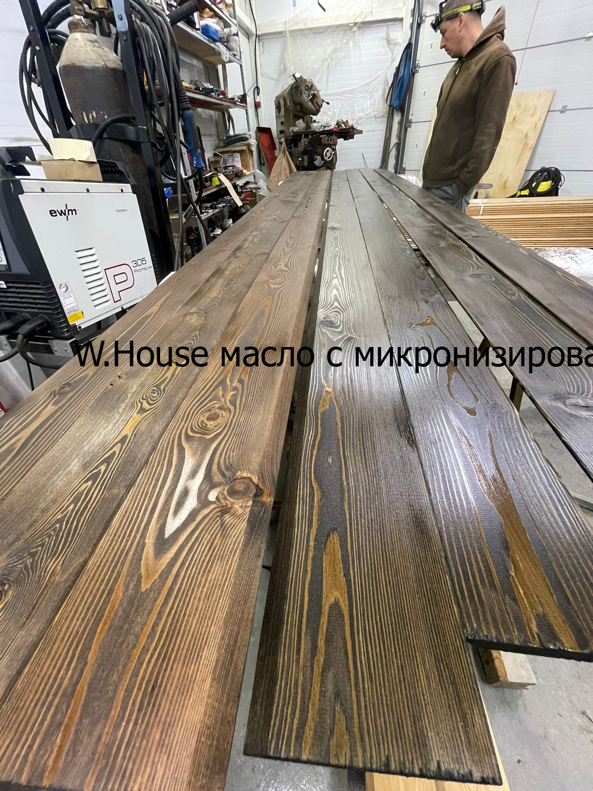 Фасадное масло с карнаубским воском и в качестве финиша масло с кварцем для блеска. Шлифовка 100 зерном, антисептирование.